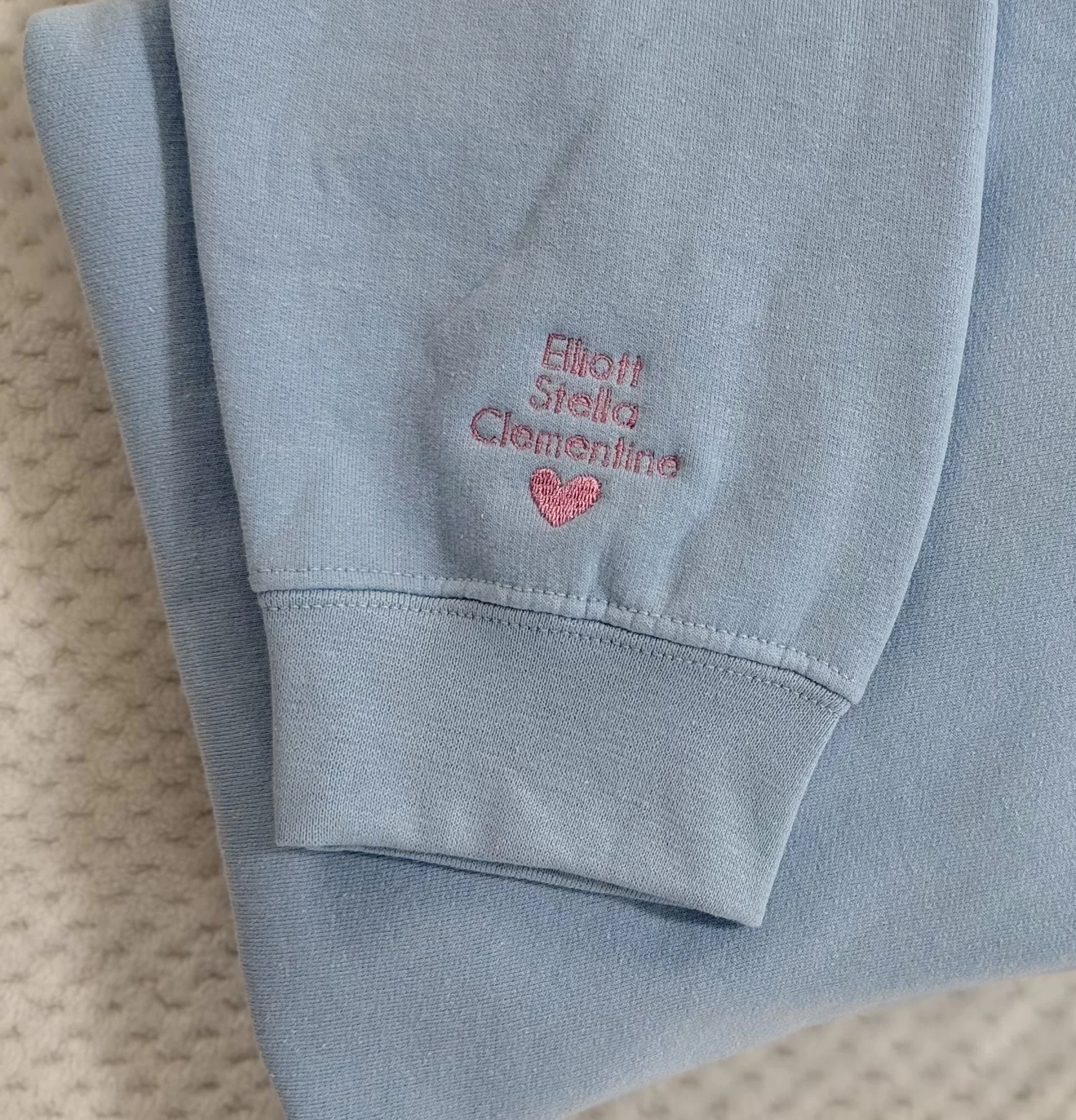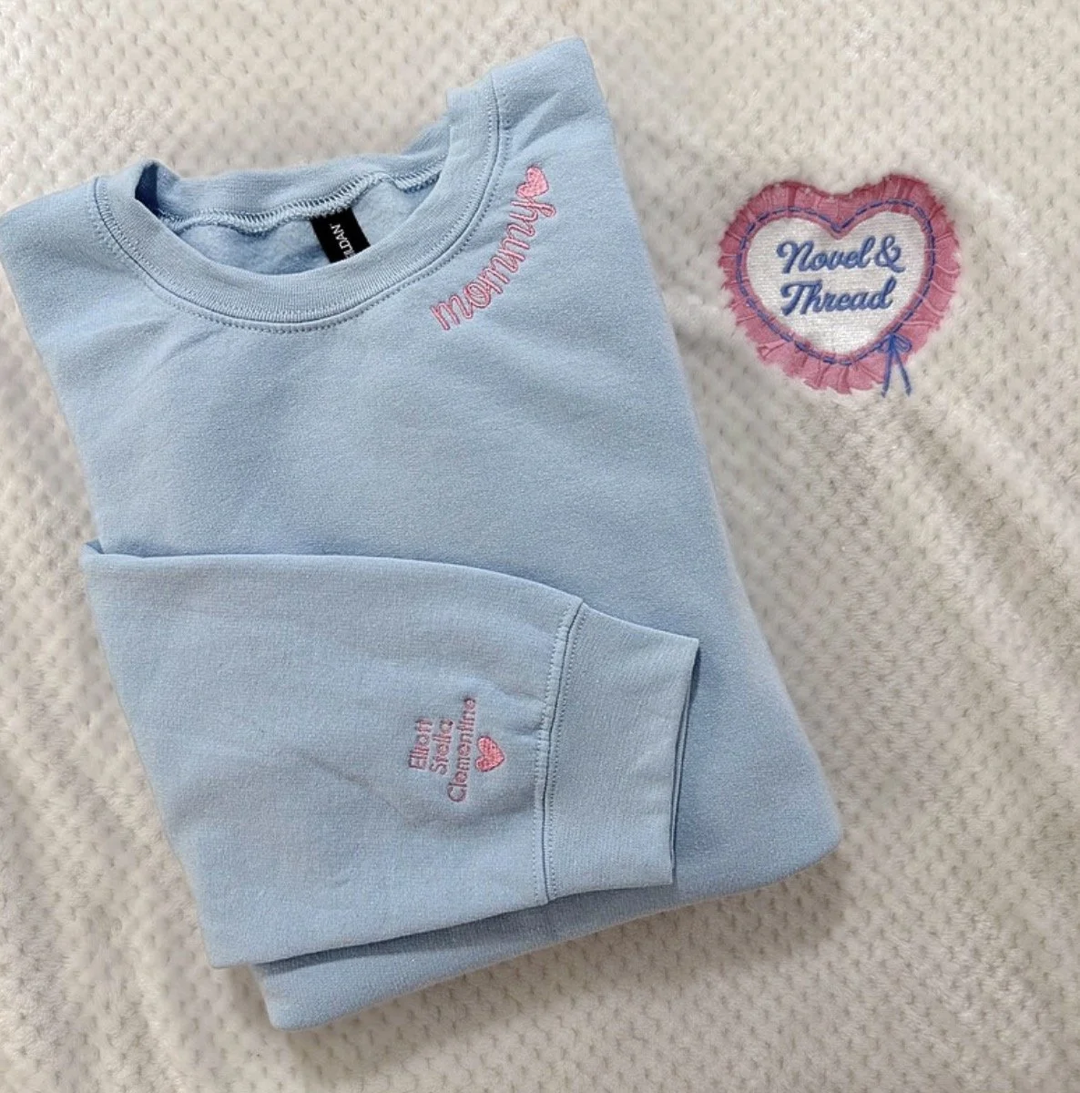 On checkout screen, please include one Thread Color, the Name/Title (limit 10 characters), and sleeve list (top→bottom, max 8 per sleeve). heart will be added unless specified to omit.