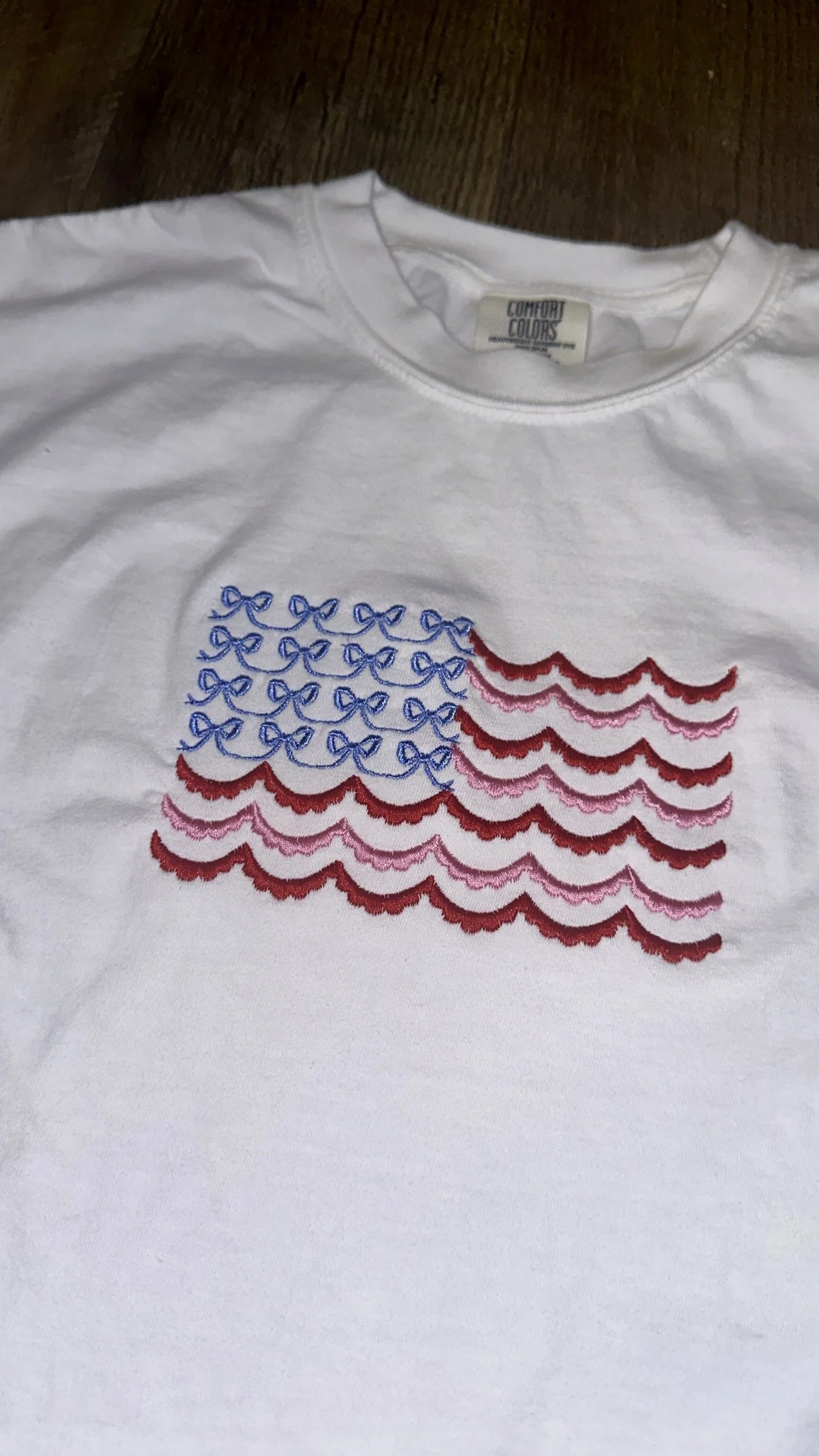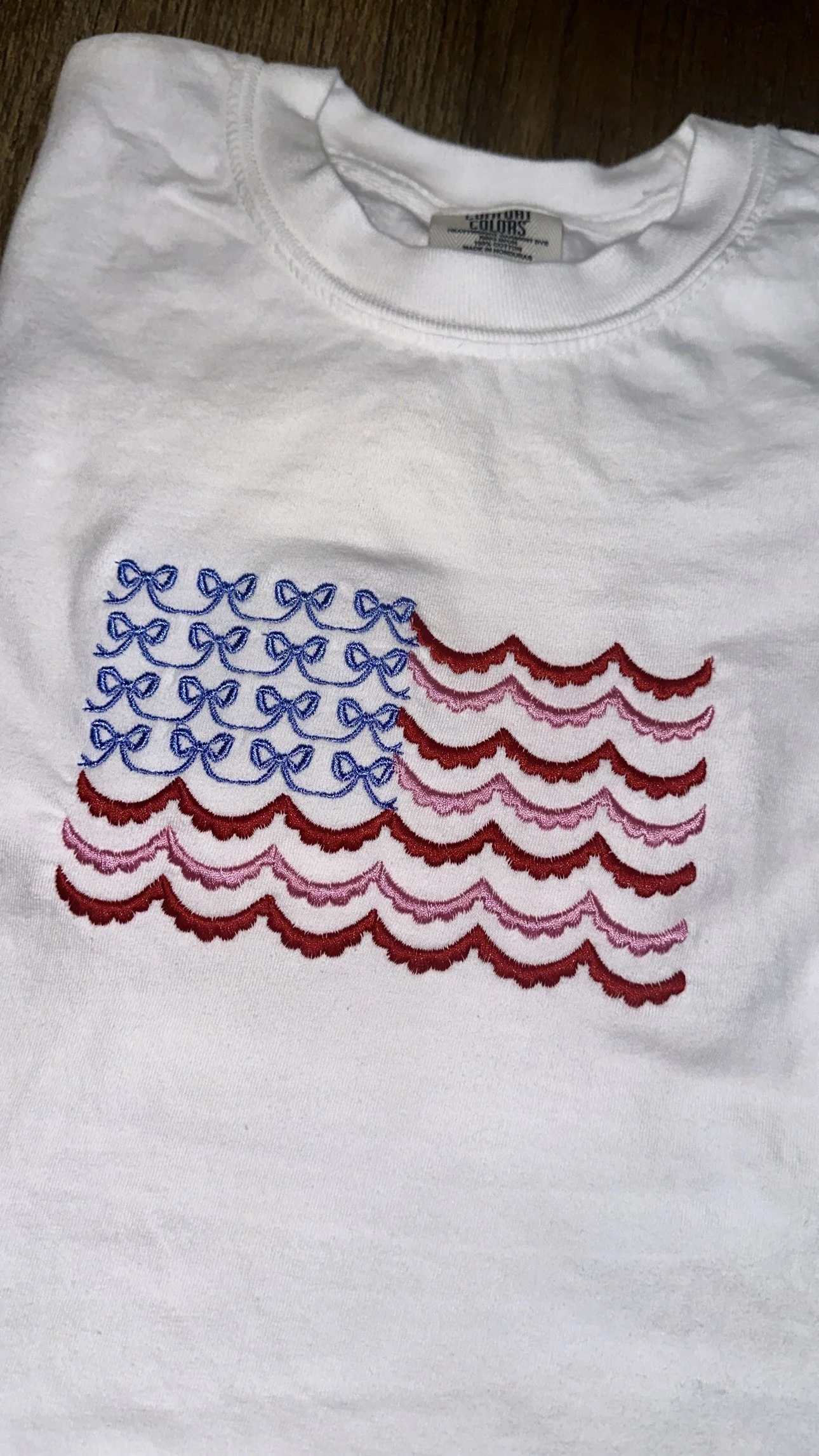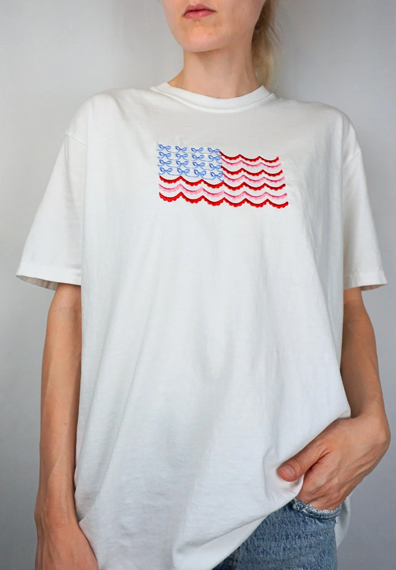 Calling all girly girls who love America! This adorable embroidered T-shirt is the perfect way to show off your patriotic spirit with a touch of sweetness. Instead of stars, we’ve sprinkled dainty little blue bows, and the classic red-and-white stripes? They’ve been given a girly makeover with red and pink scalloped lines for the cutest take on the American flag ever.