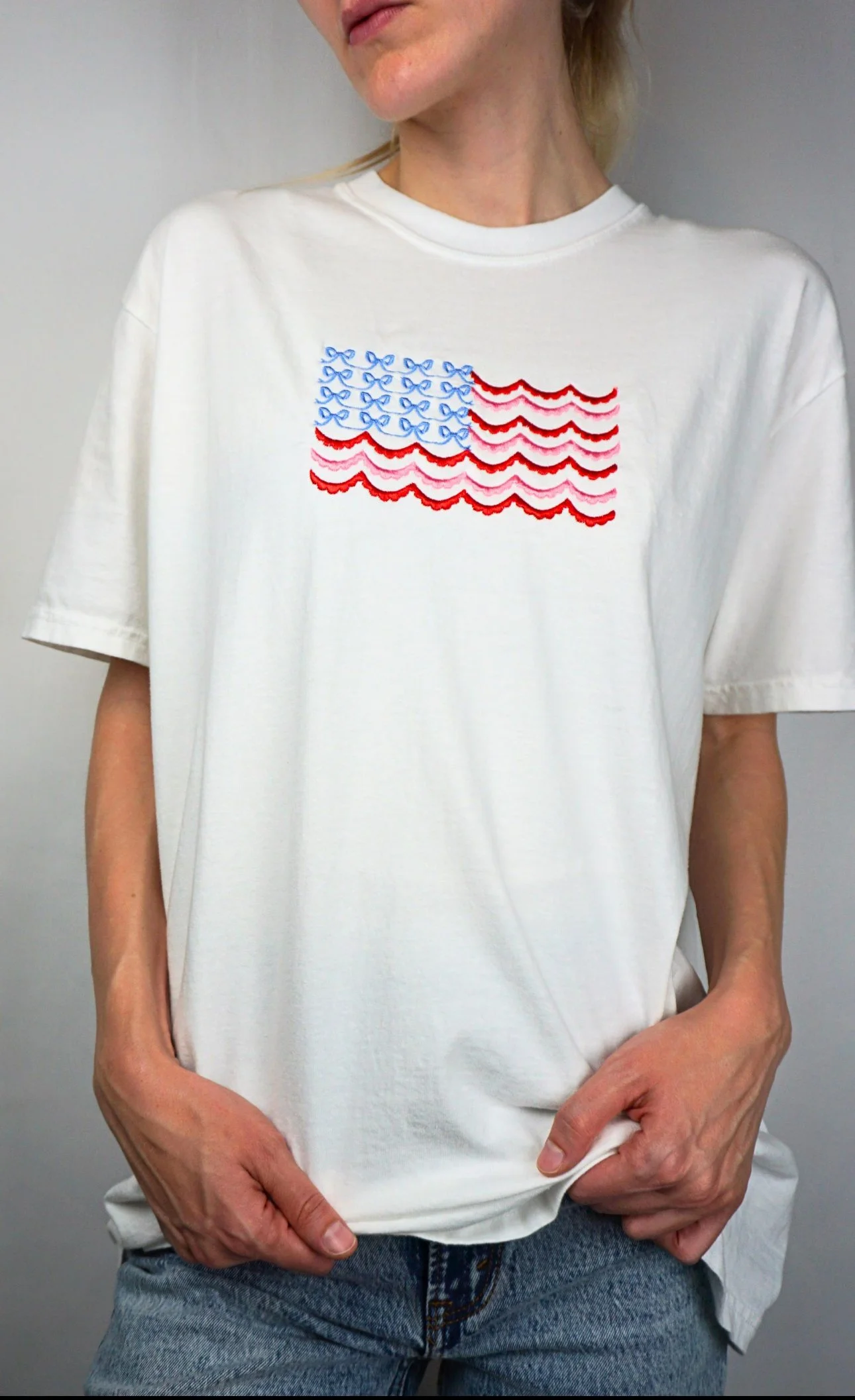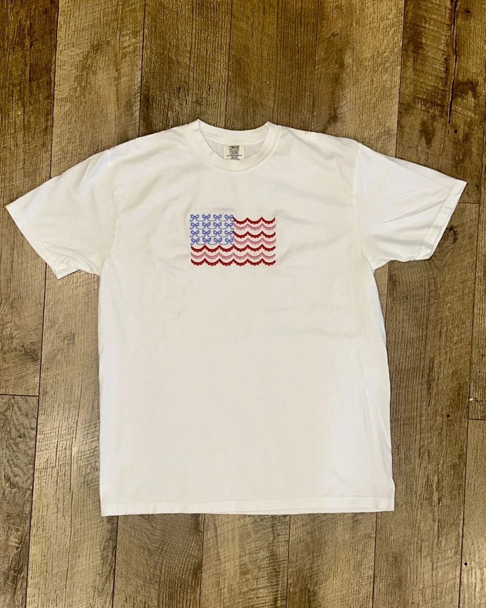 Made on a super soft, comfy tee (think your fave broken-in T-shirt feel!), this beauty is available in multiple colors so you can pick the perfect shade to match your vibe. Whether you’re celebrating the 4th of July, sipping lemonade at a summer picnic, or just want to add a little red, white & bow to your wardrobe, this embroidered tee is for YOU.