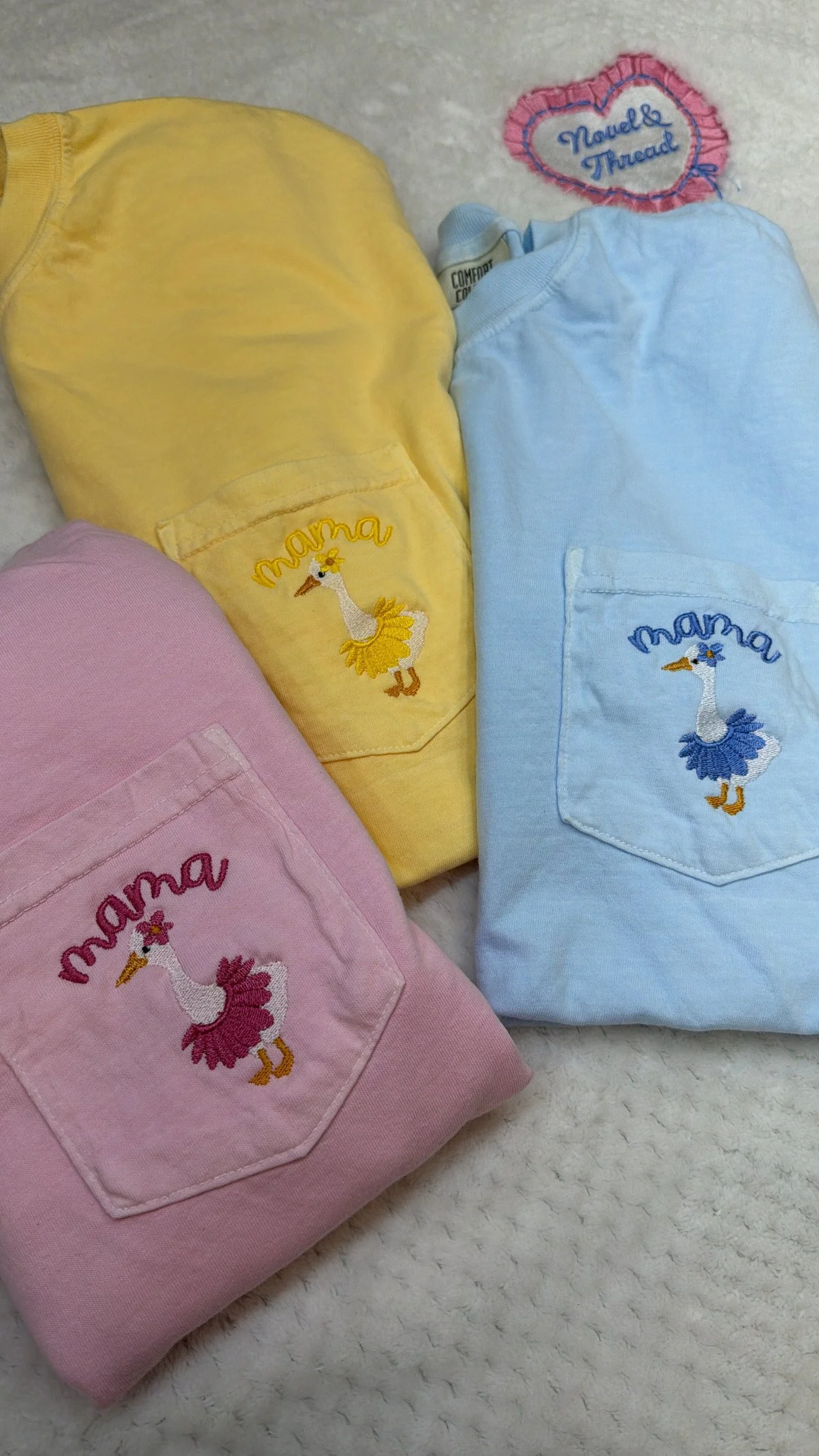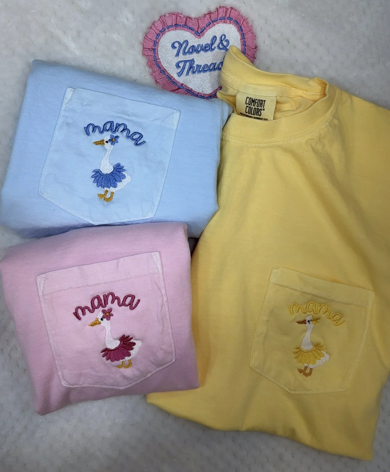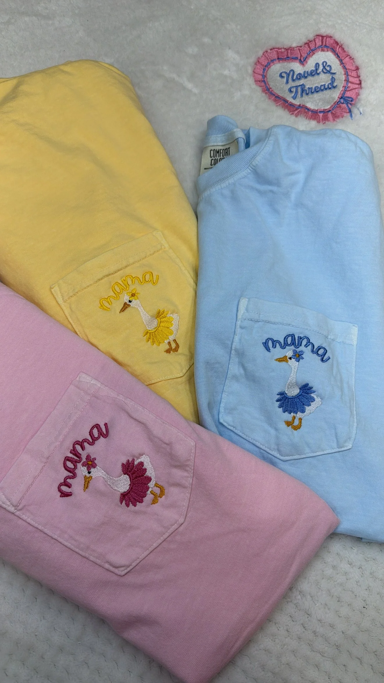 This embroidered pocket t-shirt features a darling goose design with soft “mama” lettering, giving it that charming, storybook feel while still being perfect for everyday wear. Lightweight, comfy, and effortlessly cute.